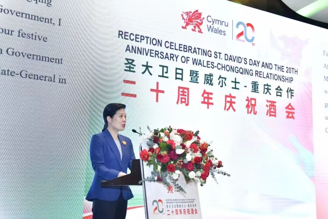 王雯在致辞中表示,从投资贸易到高等教育,从文化艺术到绿色低碳,重庆与威尔士合作领域不断拓展、成果丰硕。重庆已明确“十五五”时期的发展规划,将高水平建设中西部国际交往中心,这为两地拓展友好合作开辟了更加广阔的前景,期待两地加深各领域交流与合作,共同开启下一个精彩的二十年。